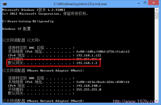 可以通過檢查電腦的默認網(wǎng)關(guān)來判斷LAN口IP地址是否已被更改,因為電腦的默認網(wǎng)關(guān)即為路由器的LAN口IP地址。查看方法:按下鍵盤上的“Windows”和“R”組合鍵——>輸入“cmd”并回車——>輸入命令“ipconfig”并回車——>在結(jié)果中找到“默認網(wǎng)關(guān)”項(部分系統(tǒng)顯示英文Default Gateway),如下圖所示
