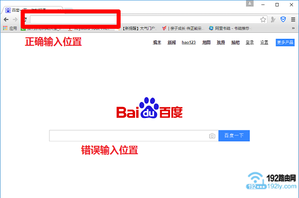 (2)、不要在瀏覽器中的搜索框中輸入192.168.1.1,是打不開(kāi)登錄頁(yè)面的。要在瀏覽器最上面,顯示網(wǎng)址的位置,輸入192.168.1.1,才能打開(kāi)登錄頁(yè)面。