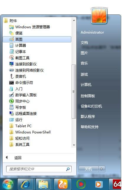 以WIN7系統(tǒng)為例,點擊“開始菜單”,然后點擊展開“所有程序”,然后點擊展開“附件”即可看到畫圖工具,如下圖所示: