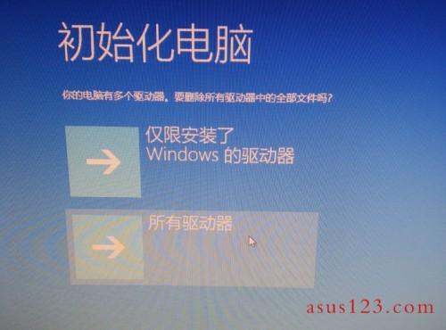 五、初始化電腦,選擇所有驅(qū)動(dòng)器或僅C盤,根據(jù)實(shí)際情況選擇,沒什么資料,就可以所有驅(qū)動(dòng)器;
