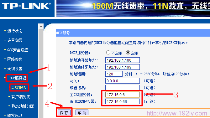 登錄到TP-Link無(wú)線路由器的管理頁(yè)面,進(jìn)入“DHCP服務(wù)器”選項(xiàng)下的“DHCP服務(wù)”模塊,在“主DNS服務(wù)器”和“備用DNS服務(wù)器”的輸入框內(nèi)填入指定的DNS服務(wù)器地址,最后點(diǎn)擊“保存”按鈕即可完成設(shè)置。