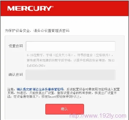 (2)、新版水星路由器:在瀏覽器中輸入:192.168.1.1然后按回車鍵——>在“設(shè)置密碼”框內(nèi)設(shè)置登錄密碼——>在“確認(rèn)密碼”框內(nèi)再次輸入設(shè)置的登錄密碼——>點(diǎn)擊“確認(rèn)”。