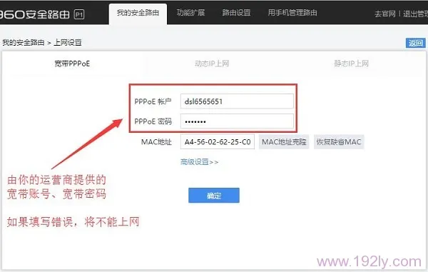 檢查360路由器中填寫的寬帶賬號、寬帶密碼是否正確