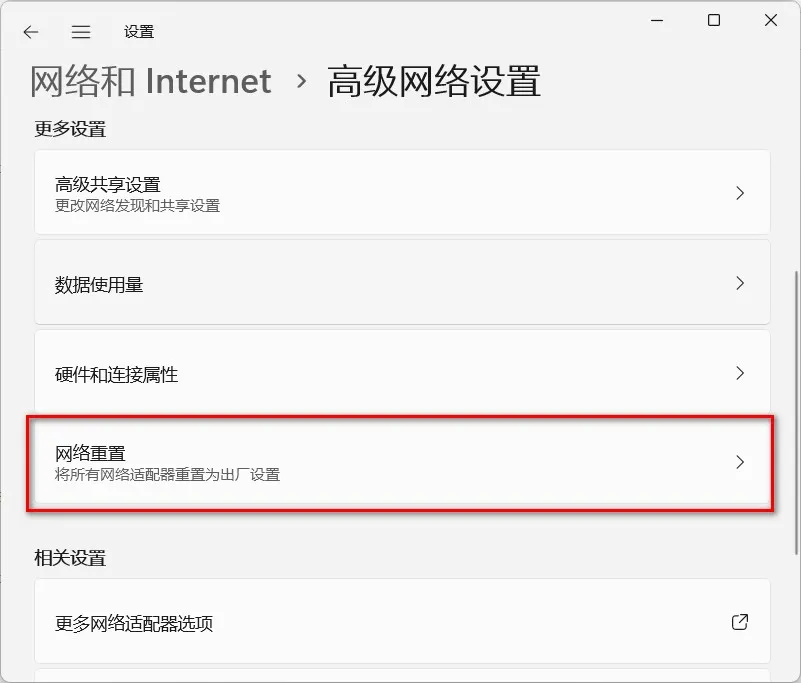 3. 執(zhí)行“網(wǎng)絡(luò)重置”操作,這里以Windows 11系統(tǒng)為例進行演示: