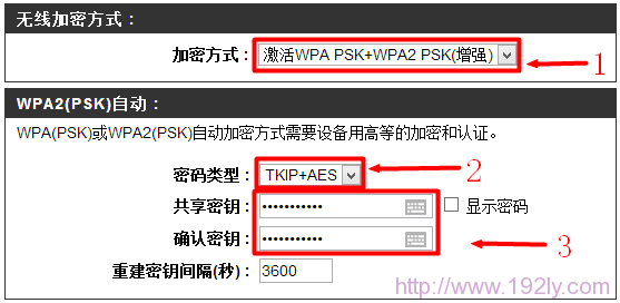 3、在右側(cè)顯示的界面里定位到“無線加密方式”的配置選項——>從下拉列表中選擇“激活WPA/PSK+WPA2/PSK(增強)”作為加密模式——>在“密碼類型”中選取“TKIP+AES”組合——>在“共享密鑰”一欄自行設(shè)定密碼(這里所說的共享密鑰即是WiFi的密碼)——>在“確認密鑰”處重復(fù)輸入剛才設(shè)定的密碼。