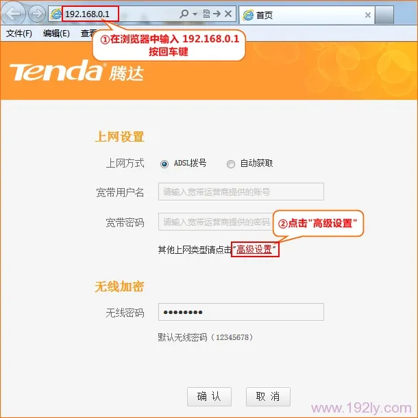 1、于瀏覽器地址欄內(nèi)輸入:192.168.0.1然后按Enter鍵——>在出現(xiàn)的新頁面里點選“高級設(shè)置”。