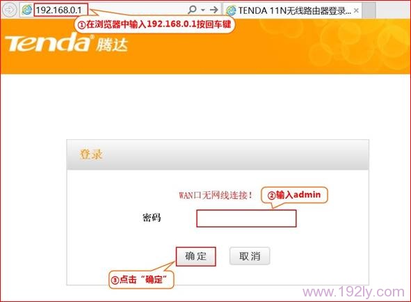 第一步:打開(kāi)瀏覽器,在地址欄輸入:192.168.0.1然后按回車(chē)鍵——> 輸入默認(rèn)的登錄密碼:admin——> 點(diǎn)擊“確定”。(若192.168.0.1無(wú)法訪(fǎng)問(wèn),請(qǐng)參考相關(guān)文章: