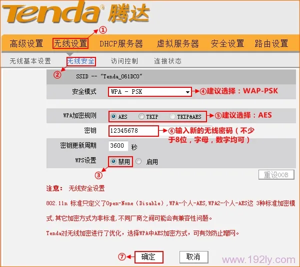 4、繼續(xù)在“無線設(shè)置”中找到“無線安全”,將“WPS設(shè)置”設(shè)為“禁用”,“安全模式”選為“WPA-PSK”,“WPA加密規(guī)則”設(shè)為“AES”,隨后填寫新的“密鑰”——>完成設(shè)置。
