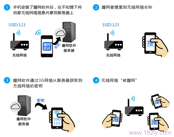 從上圖可以看出,一旦手機(jī)安裝了此類蹭網(wǎng)應(yīng)用,在連接自家WiFi的同時(shí),該應(yīng)用會將您的WiFi名稱與密碼上傳至其服務(wù)器存儲。當(dāng)其他用戶的手機(jī)安裝同樣軟件并搜索到此WiFi信號時(shí),就能獲取WiFi密碼,進(jìn)而實(shí)現(xiàn)蹭網(wǎng)。