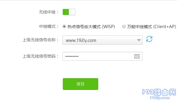 4. 在出現(xiàn)的新頁(yè)面中,首先激活“無(wú)線中繼”選項(xiàng),接著選擇“熱點(diǎn)信號(hào)放大模式(WISP)”作為中繼模式,隨后從下拉列表中選擇主路由器的無(wú)線信號(hào)名稱(chēng),在對(duì)應(yīng)的密碼字段填入主路由器的無(wú)線密碼,最后點(diǎn)擊“保存”按鈕。