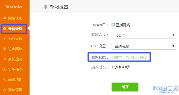 2. 成功登錄后,打開(kāi)左側(cè)菜單中的“外網(wǎng)設(shè)置”,如果右側(cè)顯示的“聯(lián)網(wǎng)狀態(tài)”為“已聯(lián)網(wǎng),您可以上網(wǎng)了”,如下圖所示,則表明無(wú)線橋接設(shè)置成功。