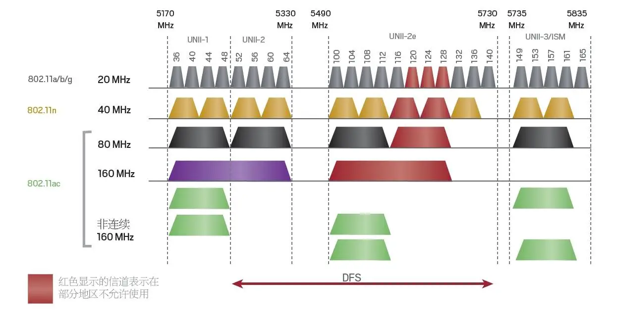 2. 對于5GWiFi的信道,建議選擇149或153。5GWiFi的工作頻率范圍為5.15G-5.85GHz,但國內(nèi)僅開放了5.8GHz附近的頻段,開放的信道包括36,40, 44, 48, 52, 56, 60, 64, 149,153, 157, 161, 165;其中36-48的信道會降低功率,導致網(wǎng)絡穩(wěn)定性較差。