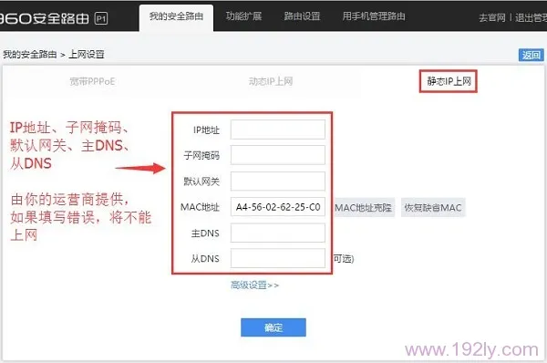 因此,請(qǐng)仔細(xì)核實(shí)在360路由器中填寫的IP地址、子網(wǎng)掩碼、網(wǎng)關(guān)、首選DNS、備選DNS是否正確。建議直接撥打運(yùn)營(yíng)商客服電話,向客服人員查詢靜態(tài)IP地址參數(shù)。