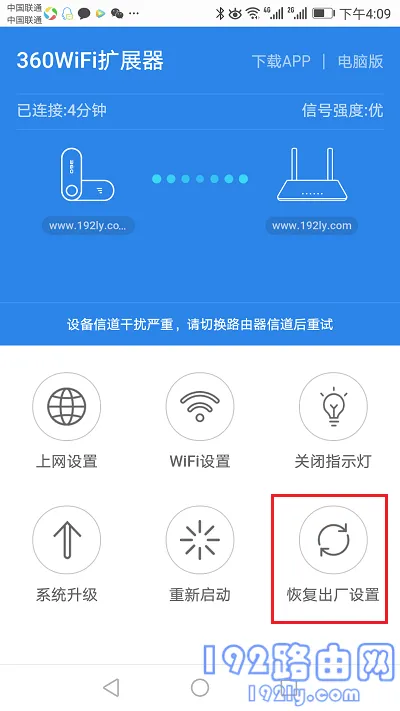 1、進入360 WiFi擴展器的設(shè)置頁面,點擊“恢復(fù)出廠設(shè)置”的選項以啟動該功能。