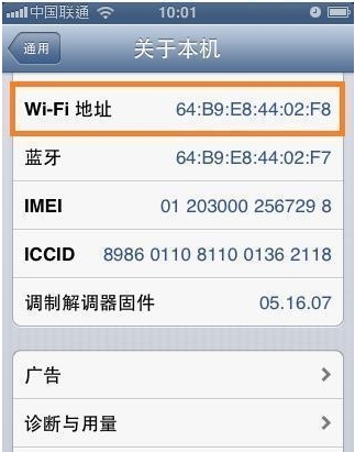3、在關(guān)于本機(jī)頁(yè)面中,查看“Wi-Fi地址”選項(xiàng)后的地址值(“Wi-Fi地址”即為所求的MAC地址),如下圖所示: