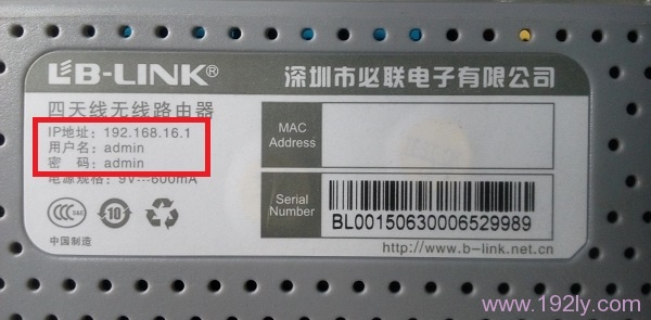 必聯(lián)(B-Link)路由器的設(shè)置網(wǎng)址(即IP地址)、默認(rèn)的管理員用戶名和密碼通常都可以在路由器底部的標(biāo)簽上找到,如下圖所示: