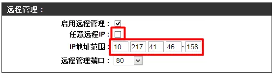 4、取消勾選“任意遠(yuǎn)程IP”,然后在下方的“IP地址范圍”中指定一個(gè)IP地址范圍;這樣,只有該范圍內(nèi)IP地址的設(shè)備能夠遠(yuǎn)程管理路由器,而其他IP地址的設(shè)備將無(wú)法執(zhí)行此操作。