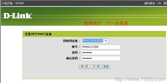 6、填入ISP寬帶服務(wù)商提供的“賬號”和“密碼”——>點(diǎn)擊“下一步”,最后保存設(shè)置。