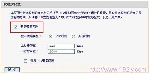 2、點(diǎn)擊“IP寬帶控制”——>“控制設(shè)置”——>選擇“ADSL線路”——>填寫上下行總帶寬值,ADSL線路上行通常為512Kbps,下行依據(jù)實(shí)際情況填寫(1M=1000Kbps)——>點(diǎn)擊“保存”。注意:在此階段暫不勾選開啟IP帶寬控制。