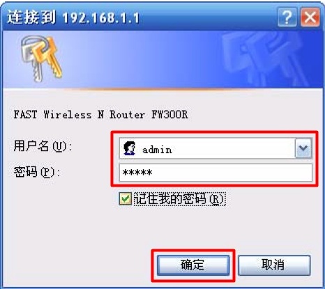 1、訪問FW300R路由器設(shè)置界面:打開瀏覽器,在地址欄輸入:192.168.1.1并按回車鍵(Enter)——>在彈出的登錄窗口中輸入默認用戶名:admin,默認密碼:admin——>點擊“確定”。