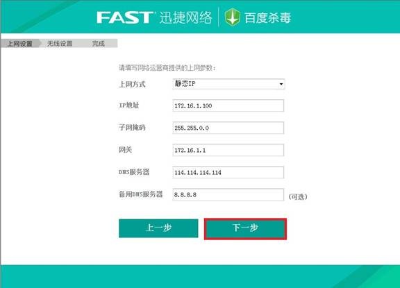 配置步驟:選擇“靜態(tài)IP”——>依據(jù)服務(wù)商提供的信息填寫相關(guān)內(nèi)容——>點擊“下一步”。