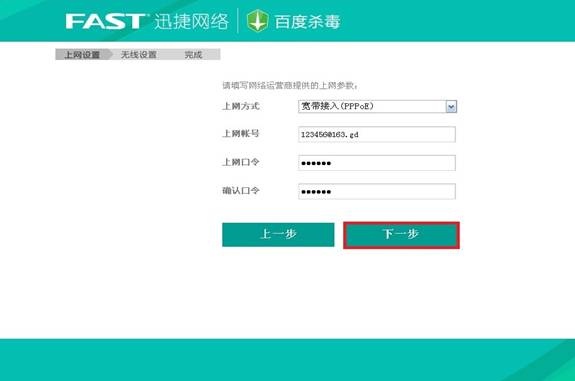 配置步驟:選擇“寬帶接入(PPPOE)”——>填寫“上網(wǎng)賬號”和“上網(wǎng)密碼”——>點擊“下一步”。