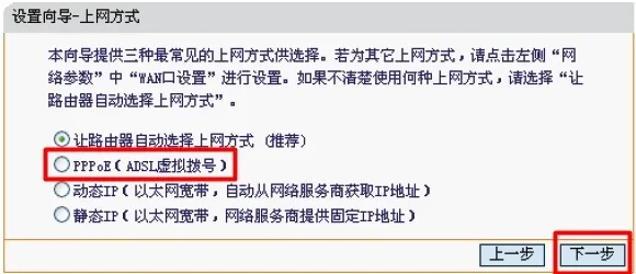 3、選擇上網(wǎng)方式:請(qǐng)選擇“PPPoE(ADSL虛擬撥號(hào))”——>點(diǎn)擊“下一步”。