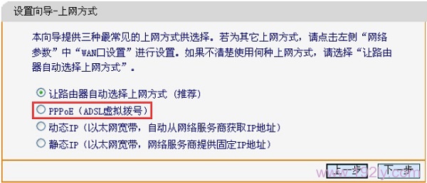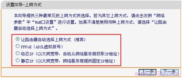 “讓路由器自動選擇上網(wǎng)方式(推薦)”這一選項不建議選用,因有時路由器可能無法準確識別,導致無法上網(wǎng);因此,手動選擇上網(wǎng)方式更為穩(wěn)妥。