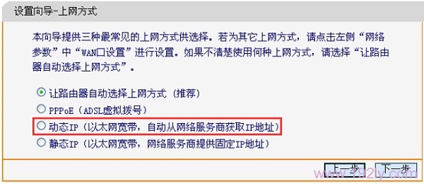 動態(tài)IP設置:選擇“動態(tài)IP(以太網(wǎng)寬帶,自動從服務商獲取IP地址)”——>點擊“下一步”