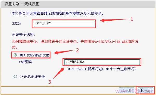 6、設置FW450R的無線網(wǎng)絡:設置“SSID”,SSID即無線網(wǎng)絡名稱,用戶可根據(jù)個人喜好進行設置——>勾選“ WPA-PSK/WPA2-PSK”——>設置“PSK密碼”——>點擊“下一步”。