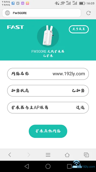輸入被擴(kuò)展信號(hào)的密碼后,稍等幾秒;若頁(yè)面顯示:易擴(kuò)展,如下圖所示,則說(shuō)明迅捷FW310RE無(wú)線(xiàn)擴(kuò)展器已成功配置。