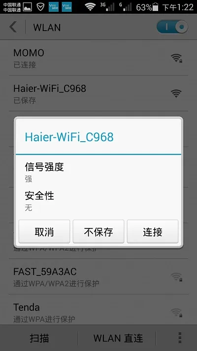 (2)、無線路由器出廠時(shí),默認(rèn)已經(jīng)啟用了無線功能,并且WiFi未加密;所以,是可以直接連接到這臺(tái)海爾路由器的WiFi信號(hào)。
