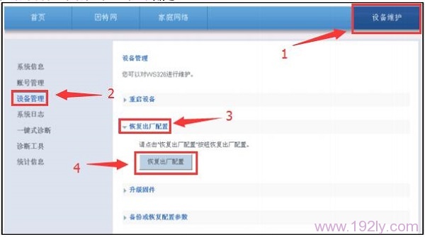 未經(jīng)允許不得轉(zhuǎn)載:路由網(wǎng) » 華為WS326恢復(fù)出廠設(shè)置方法:登錄管理界面,找到系統(tǒng)設(shè)置,點(diǎn)擊恢復(fù)出廠設(shè)置按鈕。