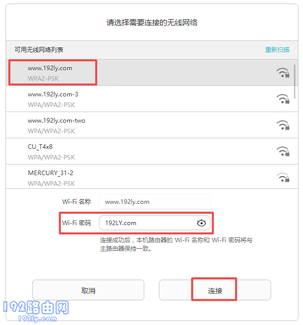 2、在新界面中,選定主路由器的 Wi-Fi名稱 ——>然后輸入 Wi-Fi密碼 ——>點(diǎn)擊 連接 即可。