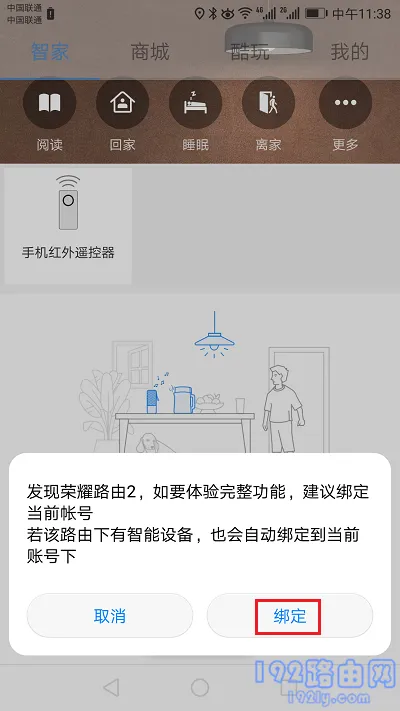 一旦檢測(cè)到榮耀路由2,頁(yè)面會(huì)提示進(jìn)行綁定,這時(shí)只需點(diǎn)擊:綁定 按鈕即可。