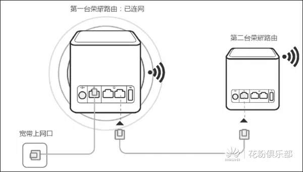 即兩個(gè)榮耀路由器通過網(wǎng)線連接后,第二個(gè)榮耀路由器會(huì)自動(dòng)完成設(shè)置,并同步第一個(gè)榮耀路由器的Wi-Fi名稱和密碼信息。
