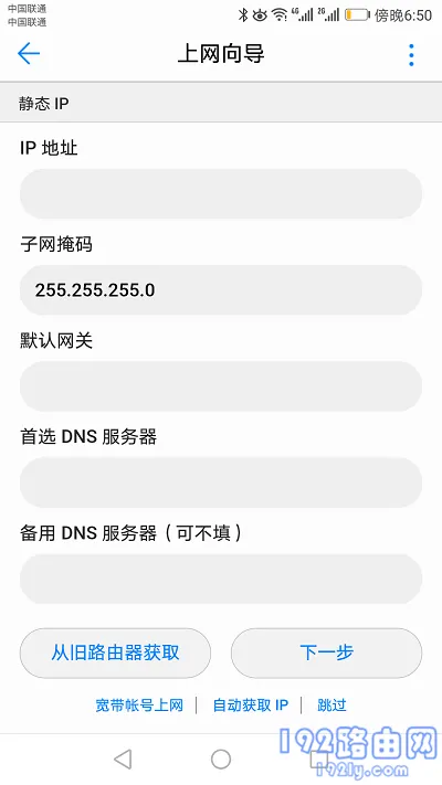 (3)若檢測(cè)到的上網(wǎng)方式為:靜態(tài)IP——>需在頁(yè)面中填寫運(yùn)營(yíng)商提供的IP地址、子網(wǎng)掩碼、默認(rèn)網(wǎng)關(guān)、首選DNS、備用DNS,如下圖所示。