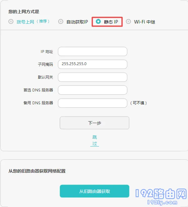 (3)如果檢測到的上網方式為靜態(tài)IP——>則需要在頁面中填寫運營商提供的IP地址、子網掩碼、默認網關、首選DNS以及備用DNS,如下圖所示。