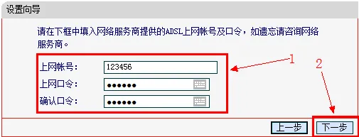 4、輸入寬帶運(yùn)營商提供的上網(wǎng)賬號和密碼。具體操作是在“上網(wǎng)帳號”欄填寫寬帶賬號,“上網(wǎng)口令”欄填寫寬帶密碼,并在“確認(rèn)口令”處重復(fù)輸入一次密碼,完成后點(diǎn)擊“下一步”。