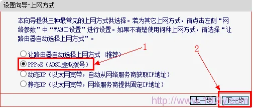3、根據(jù)實際情況選擇上網(wǎng)方式。對于大多數(shù)家庭用戶而言,采用的是ADSL虛擬撥號的方式,因此這里應(yīng)選擇“PPPoE(ADSL虛擬撥號)”,然后點(diǎn)擊“下一步”。