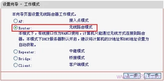 2、選擇工作模式:在此處需選擇“Router:無線路由模式”——>點(diǎn)擊“下一步”。