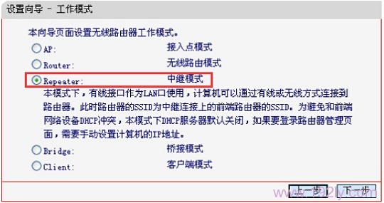 2、選擇工作模式:在此處應(yīng)選擇“Repeater:中繼模式”——>點(diǎn)擊“下一步”。