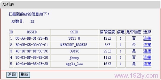 4、在掃描結(jié)果中定位主路由器的無(wú)線信號(hào)名稱(SSID)——>點(diǎn)擊“連接”。