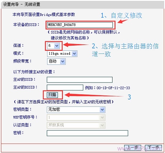 3、更改“本設(shè)備的SSID”,即MW300RM的無線WiFi名稱——>“信道”設(shè)為主路由器的信道值——>點(diǎn)擊“掃描”