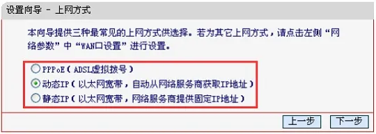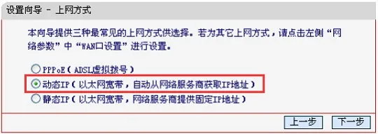 動(dòng)態(tài)IP設(shè)置:選擇“動(dòng)態(tài)IP(以太網(wǎng)寬帶,自動(dòng)從服務(wù)商獲取IP地址)”——>點(diǎn)擊“下一步”