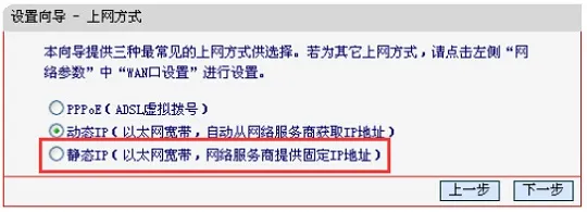 靜態(tài)IP上網(wǎng)設(shè)置:選擇“靜態(tài)IP(以太網(wǎng)寬帶,網(wǎng)絡(luò)服務(wù)商提供固定IP地址)”——>點(diǎn)擊“下一步”。