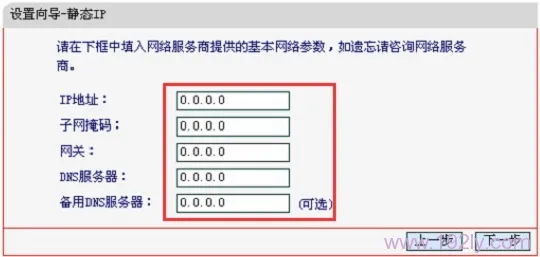 填寫(xiě)運(yùn)營(yíng)商分配的IP地址、子網(wǎng)掩碼、網(wǎng)關(guān)以及DNS服務(wù)器地址——>點(diǎn)擊“下一步”。