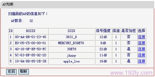 4、在掃描結(jié)果里,找到主路由器的無(wú)線信號(hào)名稱(chēng)(SSID)——>點(diǎn)擊“連接”。