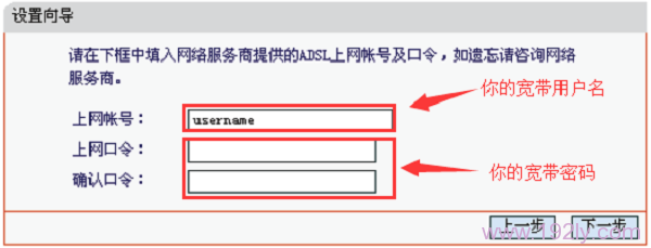 輸入寬帶服務(wù)商提供的寬帶帳號和密碼——>點擊“下一步”。