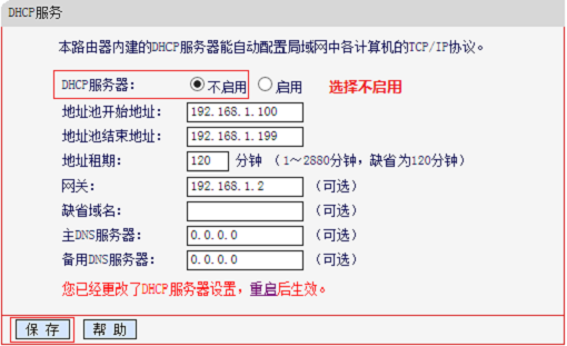 在水星MAC1200R的管理界面,點擊“DHCP服務(wù)器”——>“DHCP服務(wù)設(shè)置”——>“DHCP服務(wù)器”選擇:不啟用——>點擊“保存”并重啟路由器。